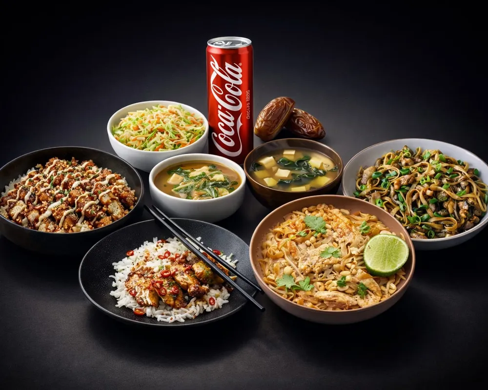 2 dattes, 1 salade de chou, 1 soupe miso, 1 plat-riz thai ou poulet crousty classic ou pad thai poulet ou nouilles poulet , 1 cheesecake , 1 canette